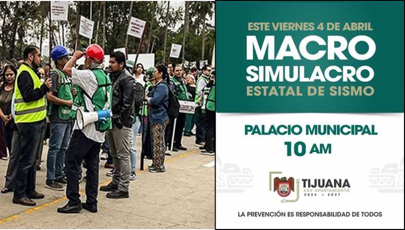 TIJUANA BC 3 DE ABRIL DE 2025 (AFN).- El personal del XXV Ayuntamiento de Tijuana participará durante el ‘Macro Simulacro Estatal’ de sismo este viernes 4 de abril a las 10:00 horas; ejercicio que sirve para preparar al personal durante una situación real, y que estará coordinada por elementos de Protección Civil Municipal y de la Dirección de Servicios Públicos Municipales.