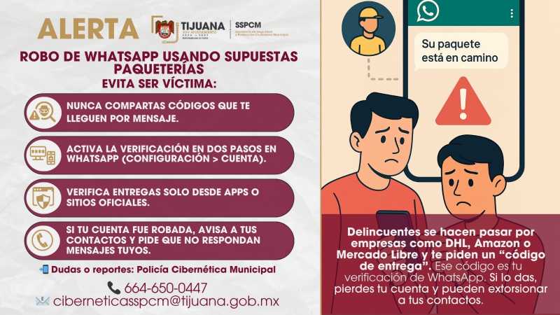 TIJUANA BC 22 DE ABRIL DE 2025 (AFN).- La Secretaría de Seguridad y Protección Ciudadana Municipal (SSPCM), a través de la Policía Cibernética, emitió una alerta por una nueva modalidad de fraude digital en la que se suplanta la identidad de empresas de paquetería como Amazon, Mercado Libre o DHL, con el objetivo de robar cuentas de WhatsApp.