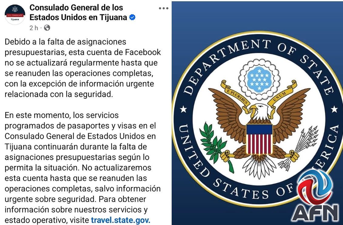Por parte del Consulado General de los Estados Unidos en Tijuana, por medio de su red social se informó que, "debido a la falta de asignación de fondos, esta cuenta de Facebook no se actualizará de manera regular hasta que se reanuden completamente las operaciones, con excepción de información urgente sobre seguridad y protección".