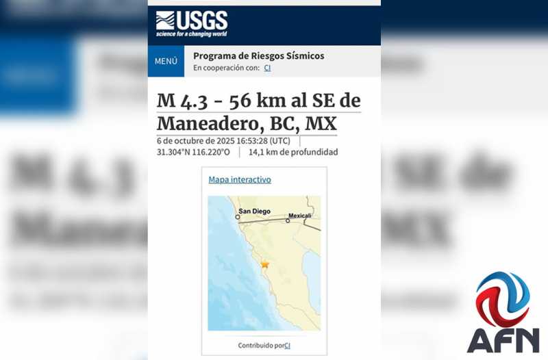 ENSENADA BC 6 DE OCTUBRE DE 2025 (AFN).- Un sismo de magnitud 4.3 se registró la mañana de este lunes 6 de octubre a las 09:53 horas, siendo perceptible en la zona urbana de Ensenada, sin que se reportaran daños materiales o personales.