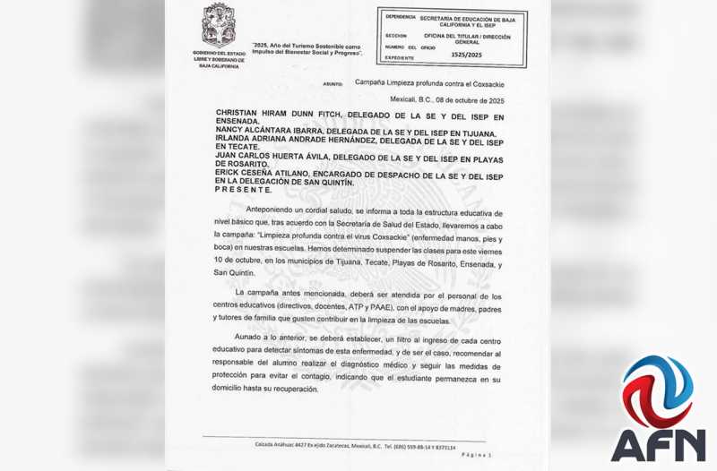 MEXICALI BC 9 DE OCTUBRE DE 2025 (AFN).- La Secretaría de Educación de Baja California informó que este viernes 10 de octubre se suspenderán clases en los planteles de Educación Básica de Tijuana, Tecate, Playas de Rosarito, Ensenada y San Quintín, para llevar a cabo la jornada de “Limpieza profunda contra el virus Coxsackie”, con el propósito de prevenir contagios de esta enfermedad, conocida como “manos, pies y boca”.