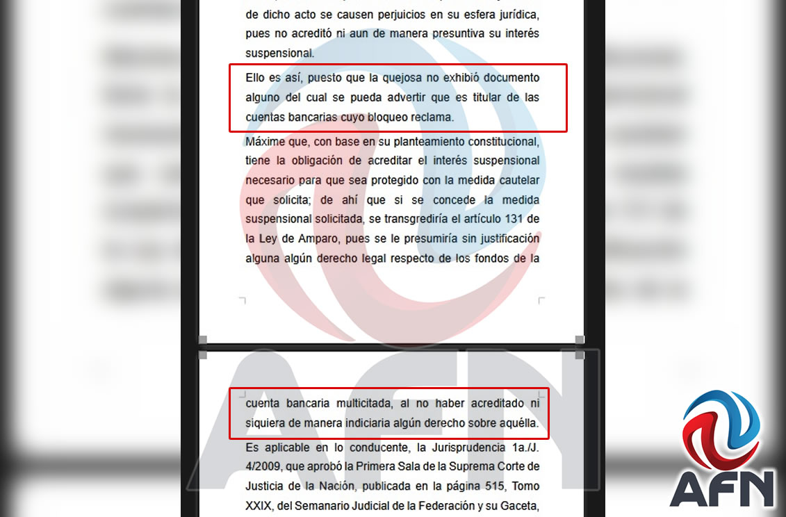 "La quejosa no exhibió documento alguno del cual se pueda advertir que es titular de las cuentas bancarias cuyo bloqueo reclama", se indicó oficialmente en el extenso documento.