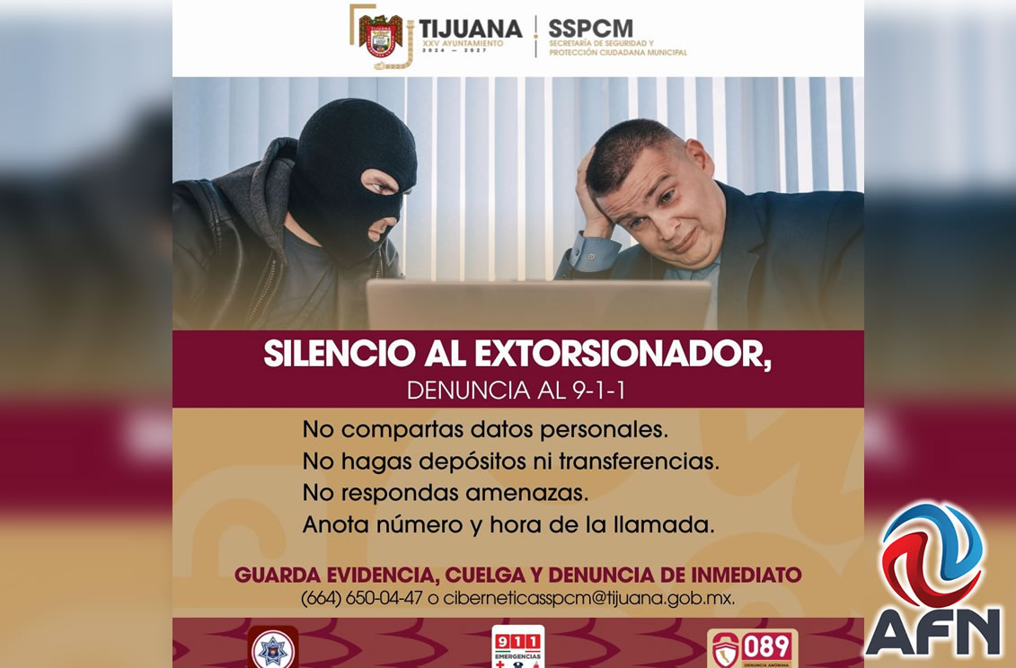 TIJUANA BC 9 DE OCTUBRE DE 2025 (AFN).- La Secretaría de Seguridad y Protección Ciudadana Municipal (Sspcm) advirtió sobre la presencia de nuevos casos de extorsión telefónica en Tijuana y llamó a la población a mantenerse alerta ante este tipo de delitos, que buscan obtener dinero o información personal mediante engaños y amenazas; entre las modalidades, dicen ser encuestadores.