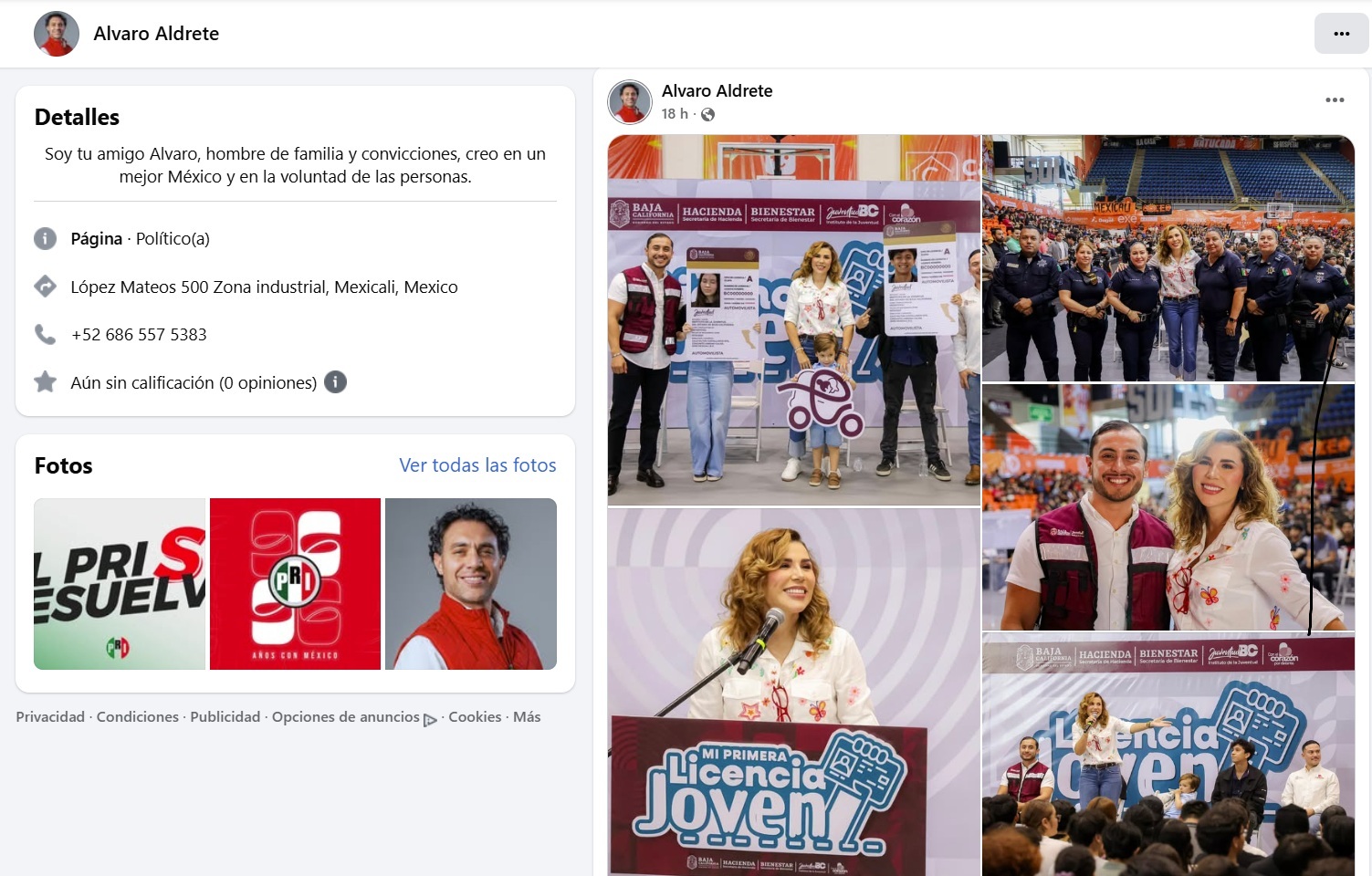 MEXICALI BC 12 DE OCTUBRE DE 2025 (AFN).- La cuenta de la red social Facebook del presidente del comité directivo estatal del PRI en Baja California, Álvaro Aldrete, fue hackeada desde hace unas semanas; y el responsable de esa acción la utiliza para difundir actividades del gobierno del Estado.