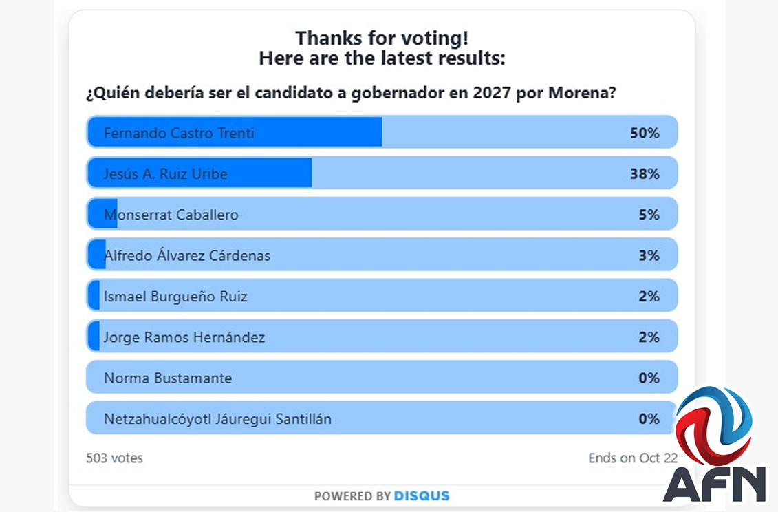 TIJUANA BC 15 DE OCTUBRE DE 2025 (AFN) Por un error en la aplicación que utilizamos para la nueva encuesta que hoy iniciamos, quedaron otras opciones fuera, por lo que estamos reponiendo el sondeo a través de una nueva aplicación.