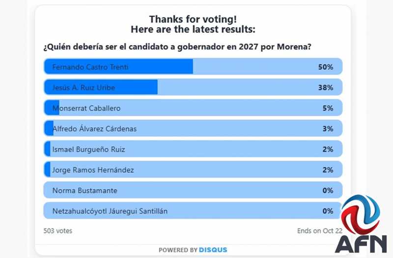 La que teníamos en la página la cerramos pero antes les informamos que en la misma y en el lapso de un poco más de una hora, se recibieron 503 votos de los cuales, el 50% fueron para Fernando Castro Trenti; el 38% para Jesús Ruiz Uribe; el 5% para Monserrat Caballero; el 3% para Alfredo Álvarez Cárdenas; el 2% para Ismael Burgueño Ruiz; el 2% para Jorge Ramos Hernández; el 0% para Norma Bustamante y el 0% para Netzahualcóyotl Jáuregui Santillán.