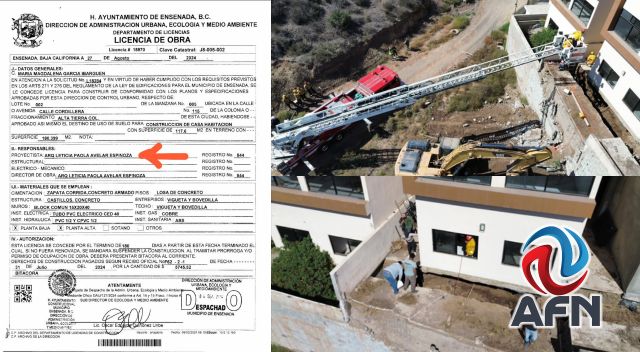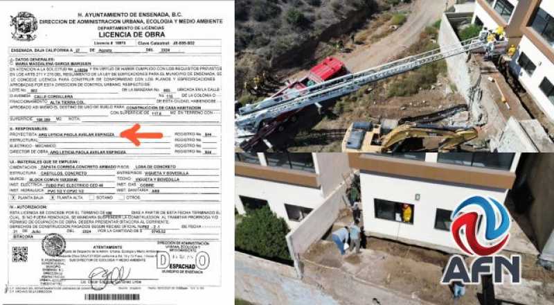 ENSENADA BC 25 DE OCTUBRE DE 2025 (AFN).- Un derrumbe ocurrido la mañana del jueves 23 de este mes en el fraccionamiento Las Palmas III (o Moderna Oeste) de la ciudad de Ensenada y que ya dejó a un trabajador muerto, se registró en una vivienda que desarrolló una funcionaria del gobierno municipal de Claudia Agaton, quien fue la proyectista y directora de la obra, según la licencia otorgada por esa autoridad local.