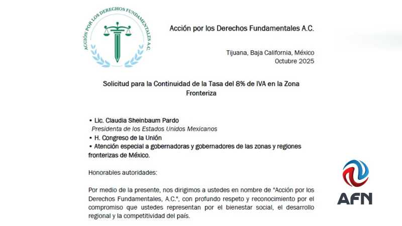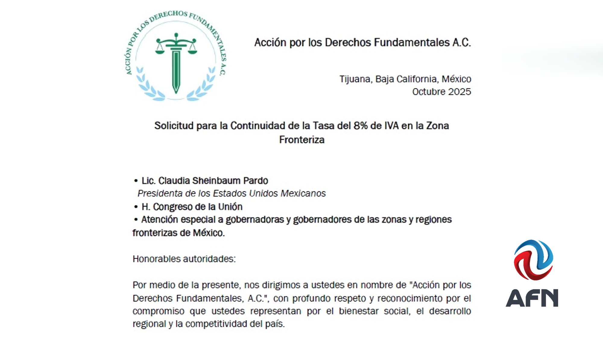 TIJUANA BC 29 DE OCTUBRE DE 2025 (AFN).- Integrantes de la asociación civil Acción por los Derechos Fundamentales, solicitaron a la presidenta Claudia Sheinbaum promover una reforma a la Ley del IVA para mantener la tasa preferencial del 8% para la región fronteriza, o bien, emitir un nuevo decreto para prorrogar la vigencia de dicho estímulo fiscal.