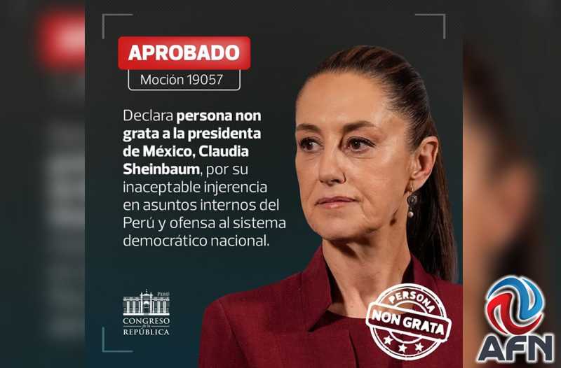 CIUDAD DE MÉXICO CDMX 6 DE NOVIEMBRE DE 2025 (AFN).- El Congreso de la República del Perú, declaró hoy como "persona non grata", a la presidenta de México, Claudia Sheinbaum Pardo, con el argumento de "injerencismo" y "ofensa al sistema democrático nacional.