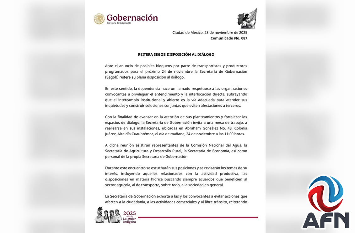 MEXICALI BC 24 DE NOVIEMBRE DE 2025 (AFN).- Ante el bloqueo de carreteras programado para este día por parte de campesinos y transportistas, la Secretaría de Gobernación (Segob) hizo un llamado al diálogo y entendimiento para la solución de conflictos.