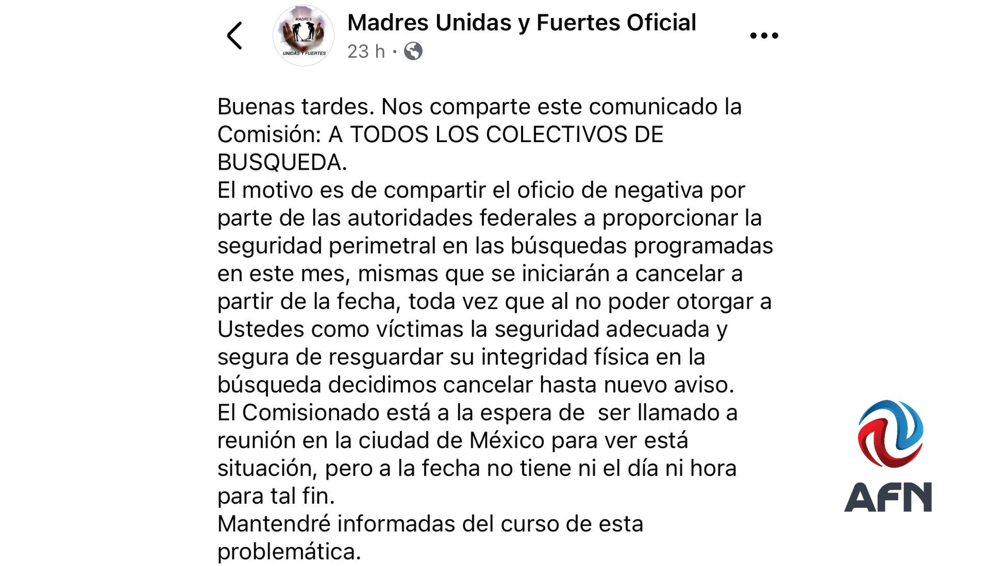 "La cancelación -manifestó la agrupación- representa un golpe para quienes participan en las búsquedas ciudadanas, pues se trata de acciones que mantienen viva la esperanza de encontrar a sus seres queridos", señalaron.