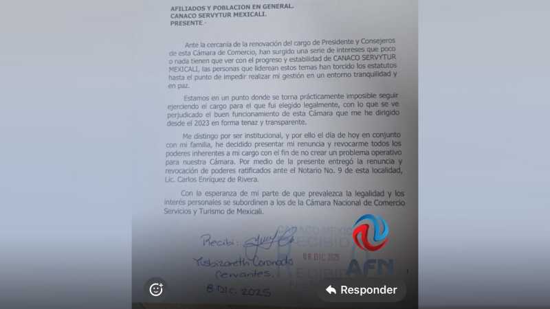 MEXICALI BC 8 DE DICIEMBRE DE 2025 (AFN).- José Antonio Villa González presentó, la noche de este lunes, su renuncia como presidente de la Cámara Nacional de Comercio (CANACO) en Mexicali, tras denunciar que se le ha impedido concluir con su gestión.
