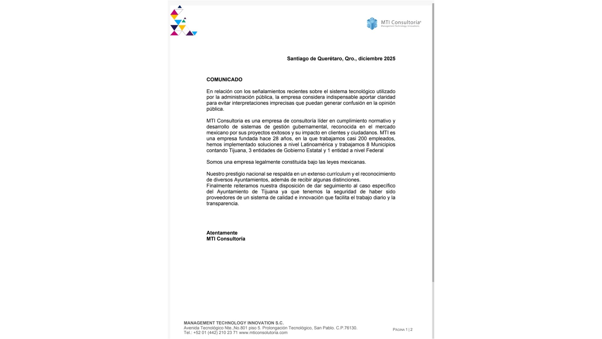 Comunicado de la empresa MTI Consultoría, dirigido a la Opinión Pública en Baja California.