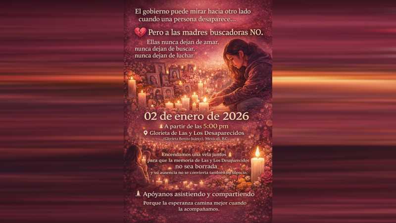 MEXICALI BC 29 DE DICIEMBRE DE 2025 (AFN).- Integrantes de la Célula de Búsqueda e Investigación en Desaparición Forzada en Baja California, anunciaron que el próximo viernes 2 de enero de 2026, realizarán el evento “Iluminemos por Las y Los Desaparecidos en Baja California”.