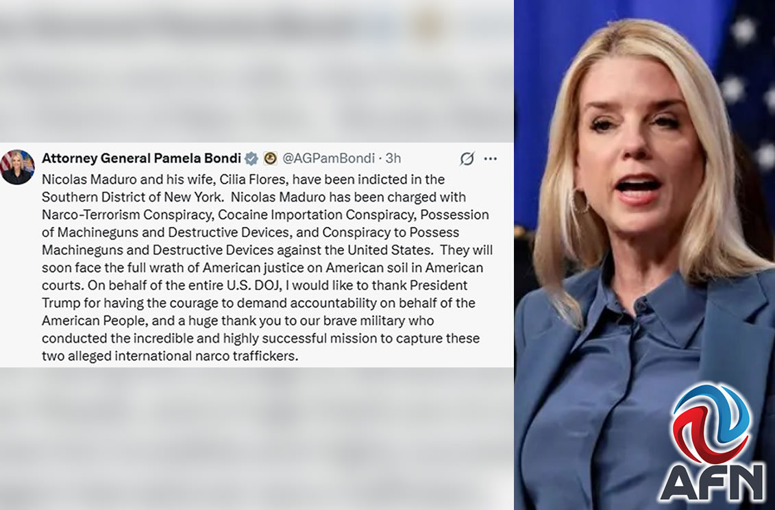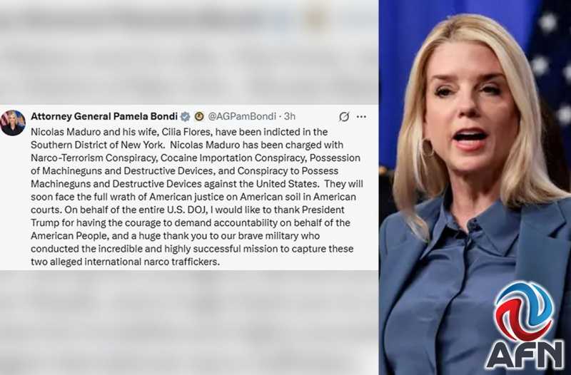 TIJUANA BC 3 DE ENERO DE 2026 (AFN).- Pamela Bondi, fiscal general de los Estados Unidos anunció que Nicolás Maduro y su esposa, fueron imputados en el distrito sur de Nueva York por el delito de conspiración narcoterrorista, entre otros.