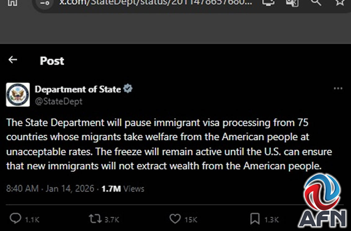 CIUDAD DE MÉXICO CDMX 14 DE ENERO DE 2026 (AFN).- El Departamento de Estado, de Estados Unidos, anunció hoy miércoles que suspenderán temporalmente la tramitación de visados de inmigrantes procedentes de 75 países; entre estos se encuentran Rusia, Brasil, Irak y otros según fuentes diversas.