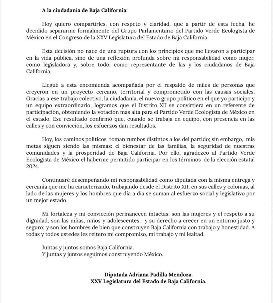 MEXICALI BC 19 DE ENERO DE 2026 (AFN).- La diputada local Adriana Padilla Mendoza anunció oficialmente su separación del grupo parlamentario del Partido Verde Ecologista de México (PVEM); de momento no anunció su incorporación a otro instituto político.