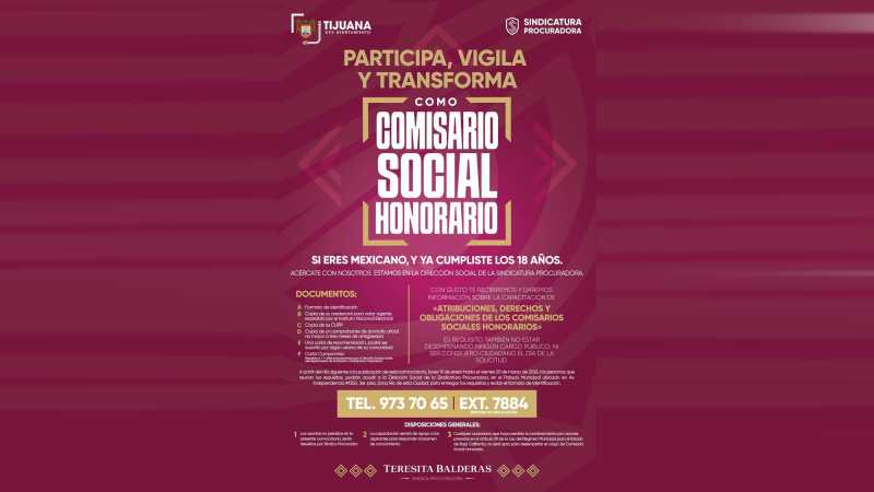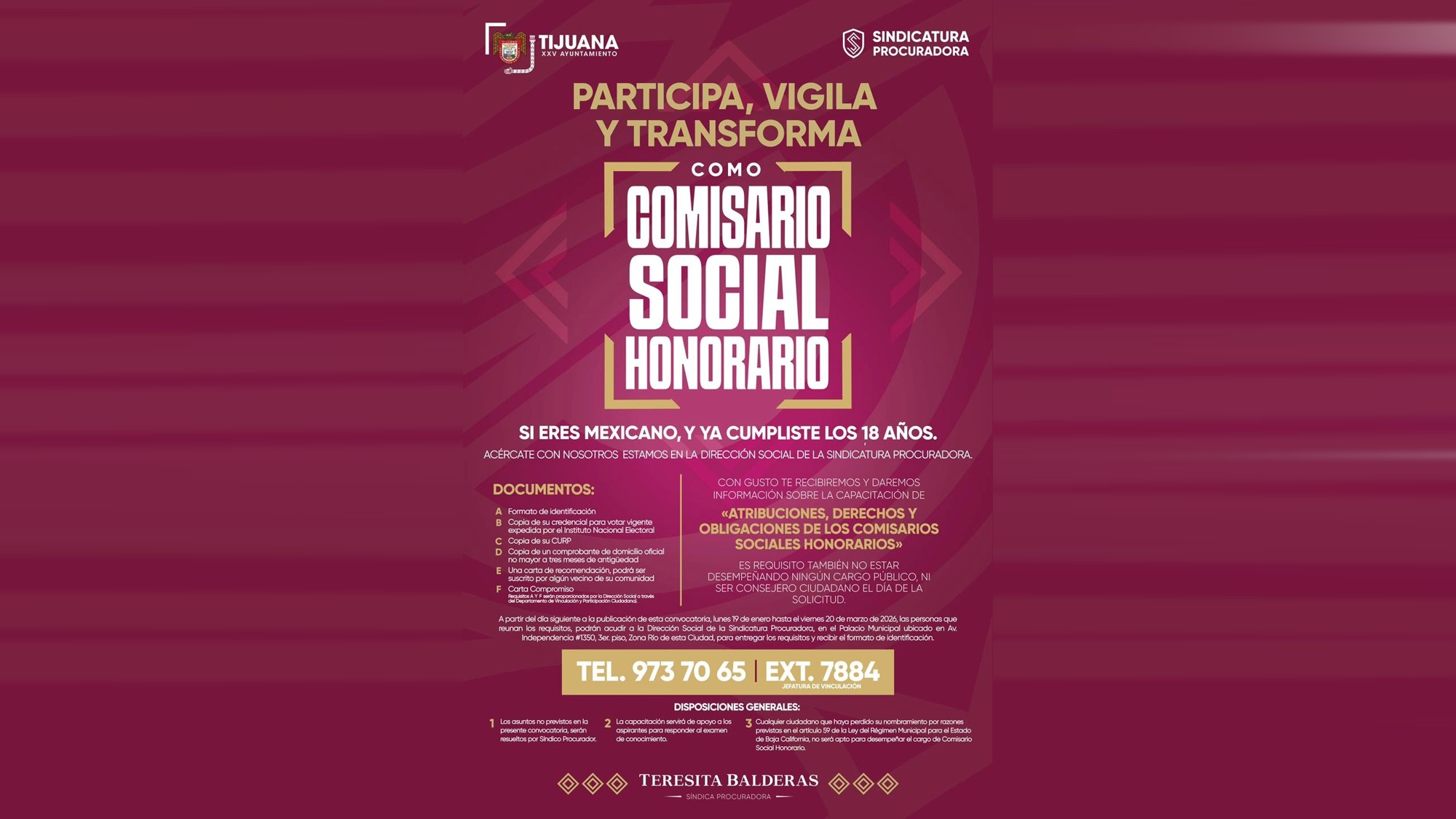 TIJUANA BC 22 DE ENERO DE 2026 (AFN).- Con el objetivo de reforzar la transparencia, la vigilancia y la rendición de cuentas en el ejercicio del gobierno municipal, la Sindicatura Procuradora convocó a la ciudadanía a participar como Comisario Social Honorario.