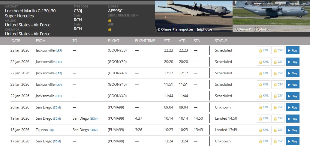 Un avión de la Fuerza Aérea de Estados Unidos, Lockheed Martin C-130J-30 Súper Hércules, con matrícula 14-5788, según registros, aterrizó en Tijuana la tarde del pasado domingo 18 de enero, y posteriormente voló a San Diego, California.