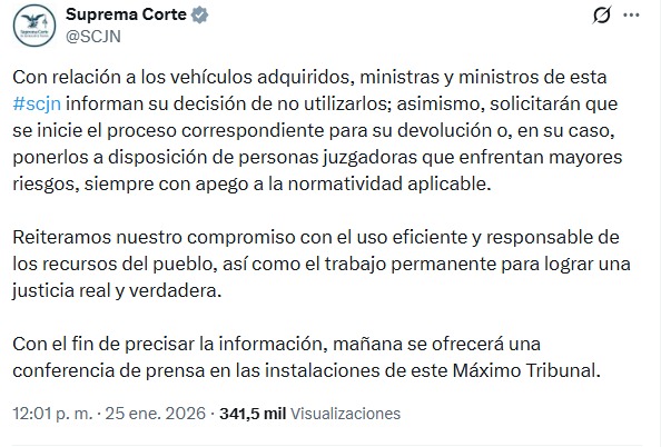 CIUDAD DE MÉXICO 25 DE ENERO DE 2026 (AFN).- La Suprema Corte de Justicia de la Nación (SCJN) anunció que los ministros decidieron no utilizar los vehículos blindados y de modelo reciente que fueron adquiridos para su protección.