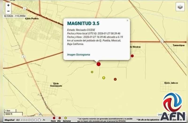 MEXICALI BC 27 DE ENERO DE 2026 (AFN).- La Coordinación Estatal de Protección Civil (CEBC) de Baja California informó que, de acuerdo con datos del Centro de Investigación Científica y de Educación Superior de Ensenada (Cicese), hoy a las 08:32 horas se registró un sismo de magnitud preliminar 3.5 grados.