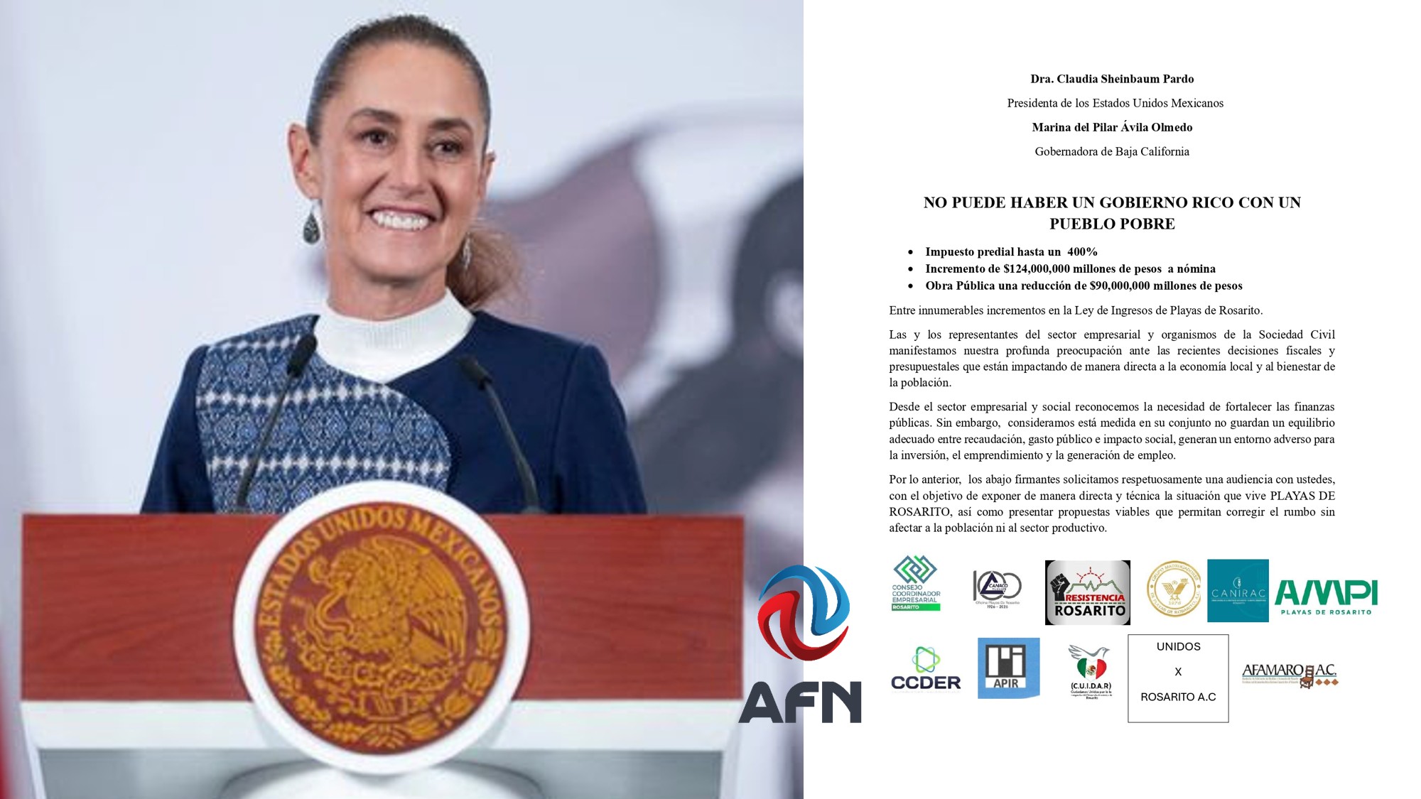 Por lo anterior, los abajo firmantes solicitamos respetuosamente una audiencia con ustedes, con el objetivo de exponer de manera directa y técnica la situación que vive PLAYAS DE ROSARITO, así como presentar propuestas viables que permitan corregir el rumbo sin afectar a la población ni al sector productivo.