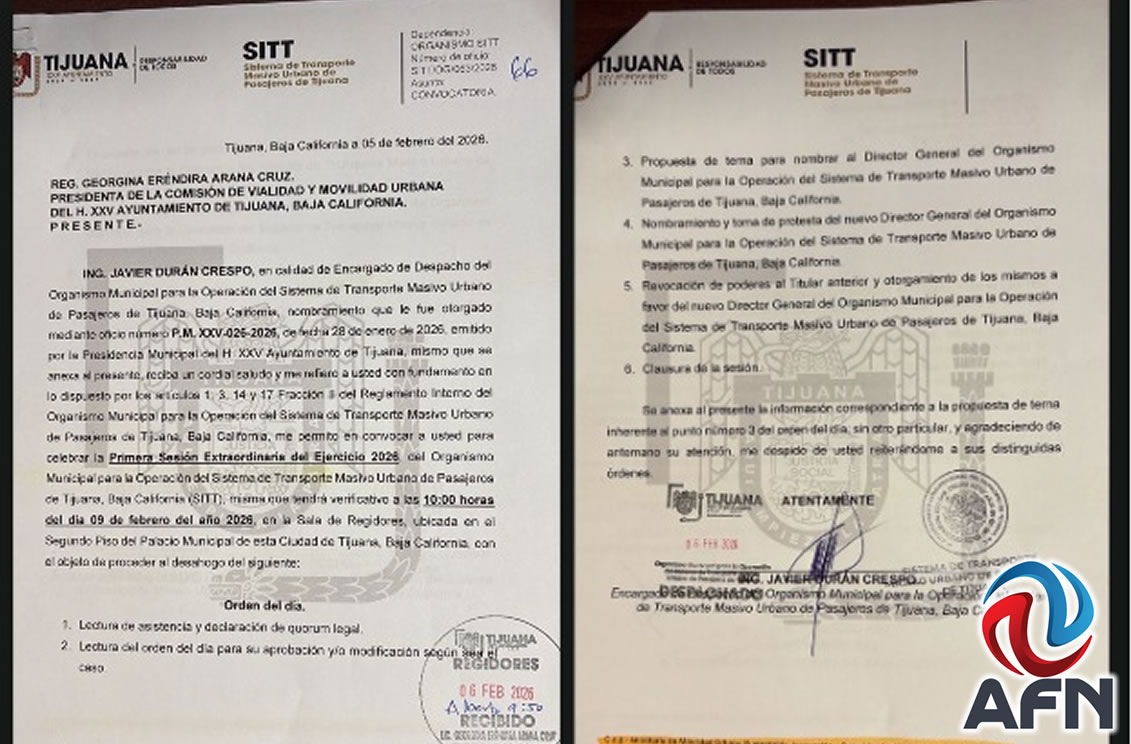 TIJUANA BC 9 DE FEBRERO DE 2026 (AFN).- Este lunes se llevará a cabo una sesión extraordinaria del Organismo Municipal para la Operación del Sistema Municipal de Transporte Masivo Urbano de Pasajeros de Tijuana (SITT), para nombrar al titular del mismo.