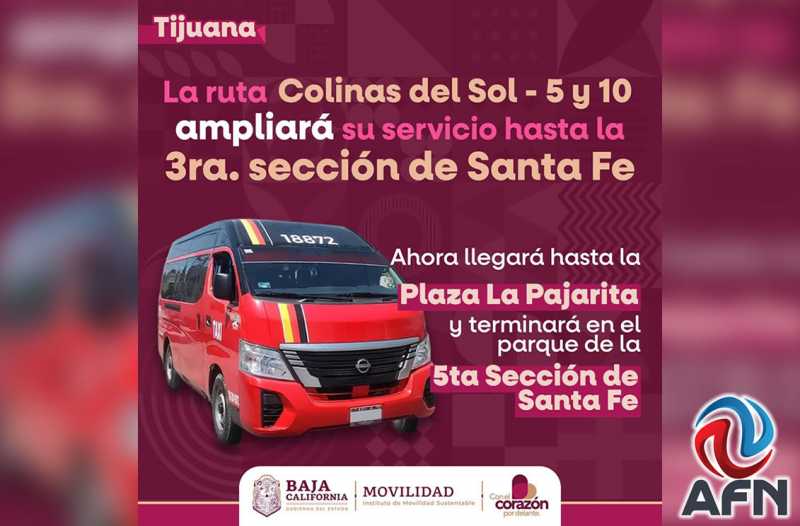 TIJUANA BC 10 DE FEBRERO DE 2026 (AFN).- El Instituto de Movilidad Sustentable de Baja California (IMOS) informó que la ruta de transporte público Colinas del Sol - "5 y 10" amplió su servicio hasta la tercera sección del fraccionamiento Santa Fe, con el objetivo de mejorar la movilidad de los usuarios de la zona.