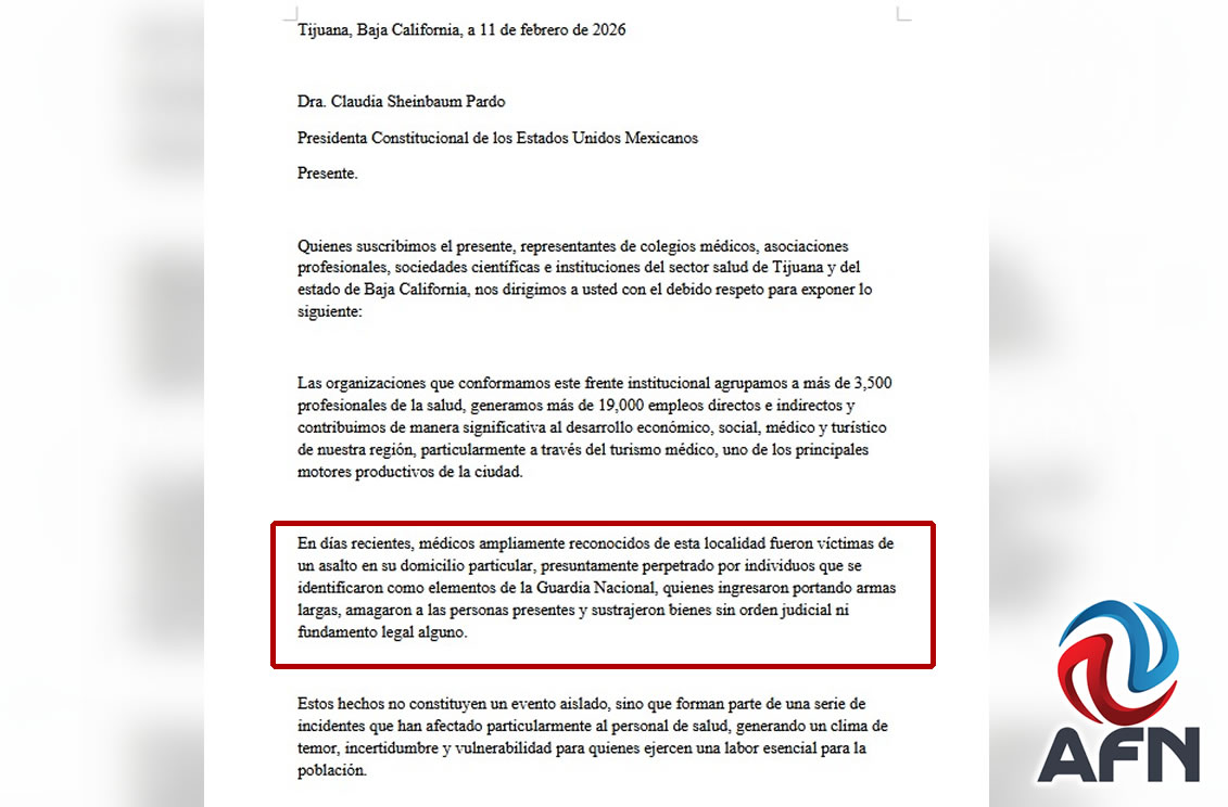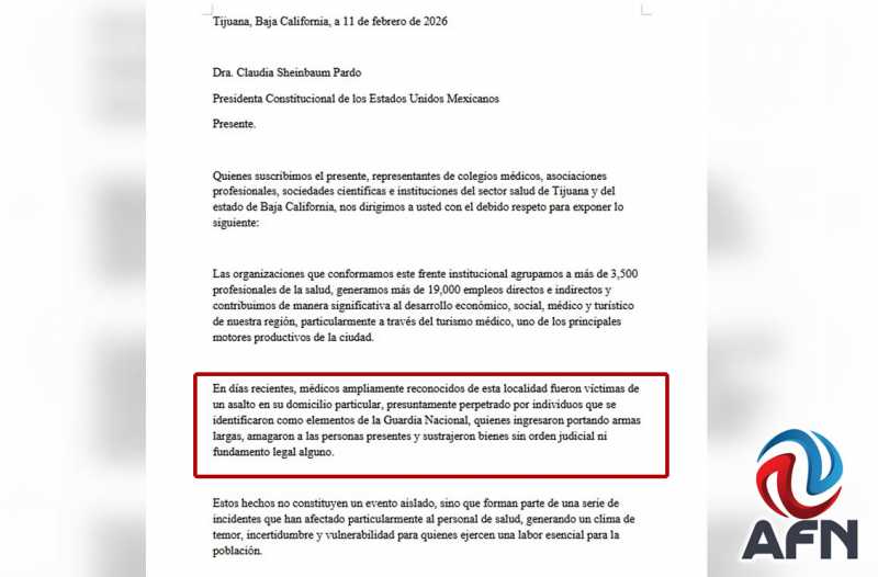 TIJUANA BC 11 DE FEBRERO DE 2026 (AFN).- Representantes de colegios, asociaciones, sociedades e instituciones del sector salud de Tijuana y Baja California, enviaron una carta a la presidenta Claudia Sheinbaum Pardo, donde exigieron que se esclarezca el caso de robo que sufrió una pareja de médicos, por parte de supuestos elementos de la Guardia Nacional.