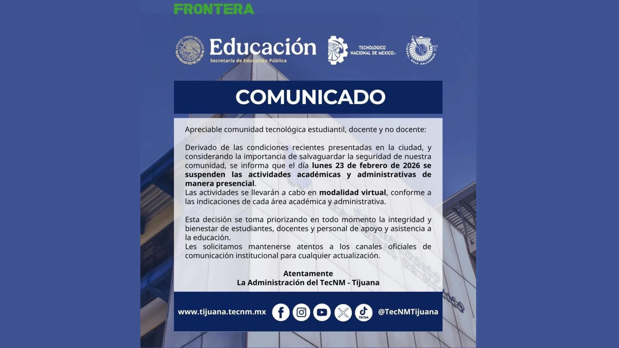 TIJUANA BC 22 DE FEBRERO DE 2026 (AFN).- El Instituto Tecnológico de Tijuana (ITT) informó la suspensión de actividades presenciales para este lunes 23 de febrero, tanto académicas como administrativas, derivado de las condiciones de violencia presentadas en la ciudad.