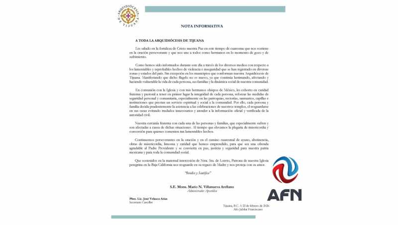 TIJUANA 22 DE FEBRERO DE 2026 (AFN).- La Arquidiócesis de Tijuana llamó a que cada persona y cada familia decida prudentemente su asistencia a las celebraciones en los templos, ante los recientes hechos de violencia e inseguridad registrados en distintas zonas del país.