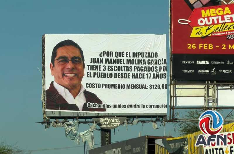 MEXICALI BC 25 DE FEBRERO DE 2026 (AFN).- Un espectacular con la imagen del diputado morenista Juan Manuel Molina apareció sobre calzada Independencia, con un mensaje donde solicitan que se le retiren los escoltas que ha mantenido durante 17 años, argumentando que su costo mensual al erario público es de 120 mil pesos, firmado por "Cachanillas Unidos contra la Corrupción".