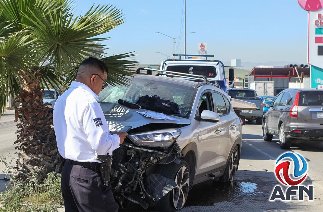 TIJUANA BC 25 DE FEBRERO DE 2026 (AFN).- Un accidente vehicular se registró la mañana de este miércoles 25 de febrero sobre el bulevar Josefa Ortiz de Domínguez a la altura de la colonia Lomas Virreyes, donde una conductora perdió el control de su vehículo y terminó impactada contra una palmera del camellón central.