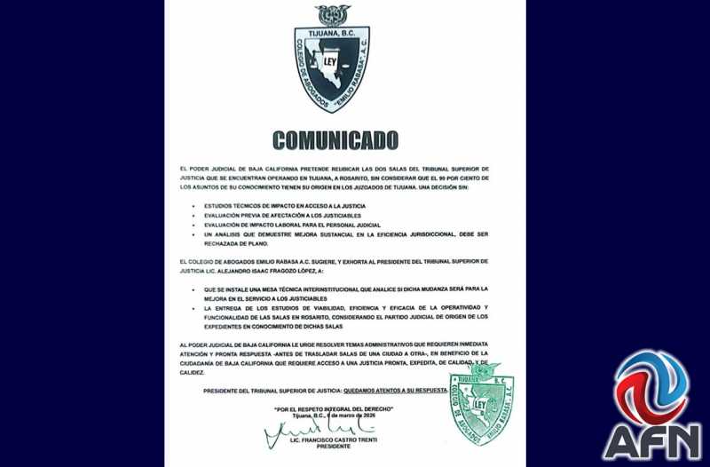 TIJUANA BC 6 DE MARZO DE 2026 (AFN).- Integrantes del Colegio de Abogados "Emilio Rabasa" expresaron su rechazo a la reubicación de dos salas del Tribunal Superior de Justicia (TSJ) de Baja California, de Tijuana a Playas de Rosarito.