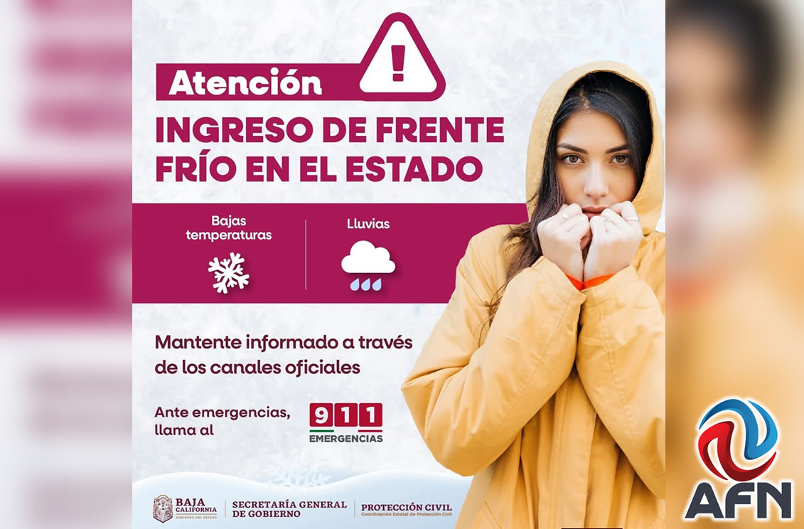 Por parte de la deoendencia estatal, se advirtió a la población sobre los efectos del frente frío número 39, que impactará a la entidad durante el fin de semana, sobre todo en Tijuana y Rosarito, con lluvias, descenso de temperatura, vientos fuertes y oleaje elevado.