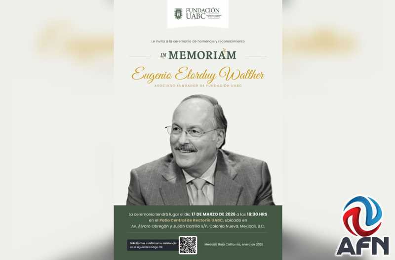 MEXICALI BC 16 DE MARZO DE 2026 (AFN).- La Universidad Autónoma de Baja California a través de la Fundación UABC, realizará un homenaje al exgobernador Eugenio Elorduy Walther, este martes 17 de marzo en el patio central de Rectoría.