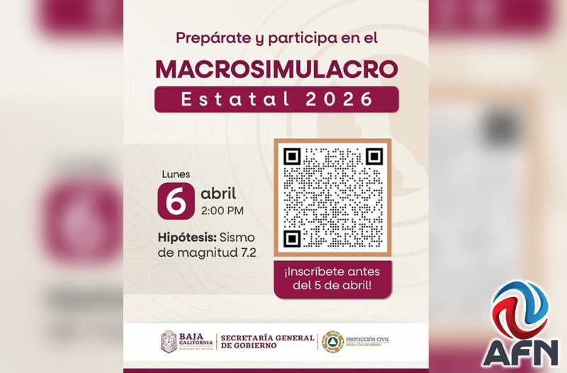 TIJUANA 27 DE MARZO DE 2026 (AFN).- Con la hipótesis de que ocurrirá un sismo con intensidad de 7.2 grados, la Coordinación Estatal de Protección Civil (CEPC) de Baja California anunció que el próximo lunes 6 de abril de 2026 se realizará el "Macrosimulacro Estatal 2026", esta vez en el turno vespertino, a las 14:00 horas.