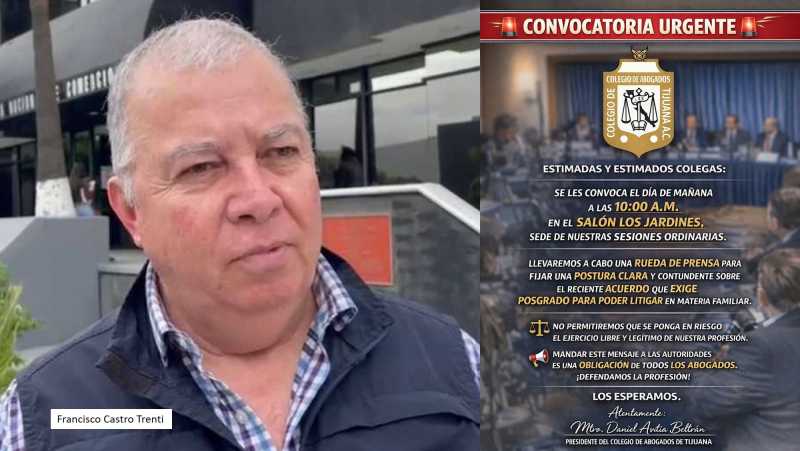 Abogados, particularmente de Tijuana, están manifestando su descontento por esa decisión y grupos como el colegio de abogados de Tijuana, encabezado por Daniel Avitia Beltrán, están llamando de manera urgente a todos los profesionales del derecho a una reunión para este miércoles, en la que además pretenden fijar una postura "clara y contundente" ante los medios de comunicación, en torno a este acuerdo que exige posgrado para poder litigar en materia familiar.