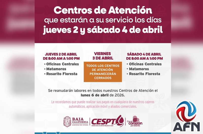 TIJUANA BC 1 DE ABRIL DE 2026 (AFN).- Para facilitar el pago a sus usuarios, y evitar traslados innecesarios, la Comisión Estatal de Servicios Públicos de Tijuana (Cespt) dio a conocer los horarios de sus centros de atención para esta Semana Santa.