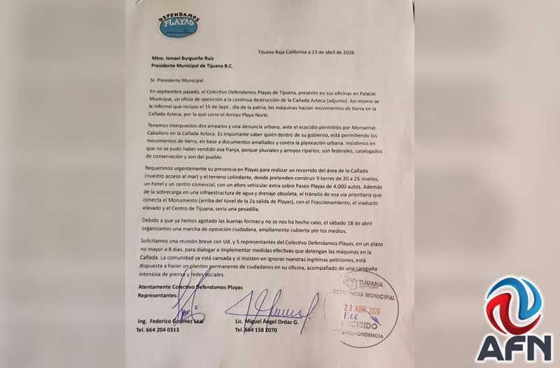 TIJUANA BC 24 DE ABRIL DE 2026 (AFN).- Residentes de Playas de Tijuana, organizados mediante el Colectivo Defendamos Playas, informaron que solicitan ser recibidos por el presidente municipal, Ismael Burgueño Ruiz, para plantearle directamente los problemas que existen en la Cañada Azteca por un desarrollo habitacional que se realiza en la zona, que, a su juicio, afecta el ecosistema y la calidad de vida de los vecinos.