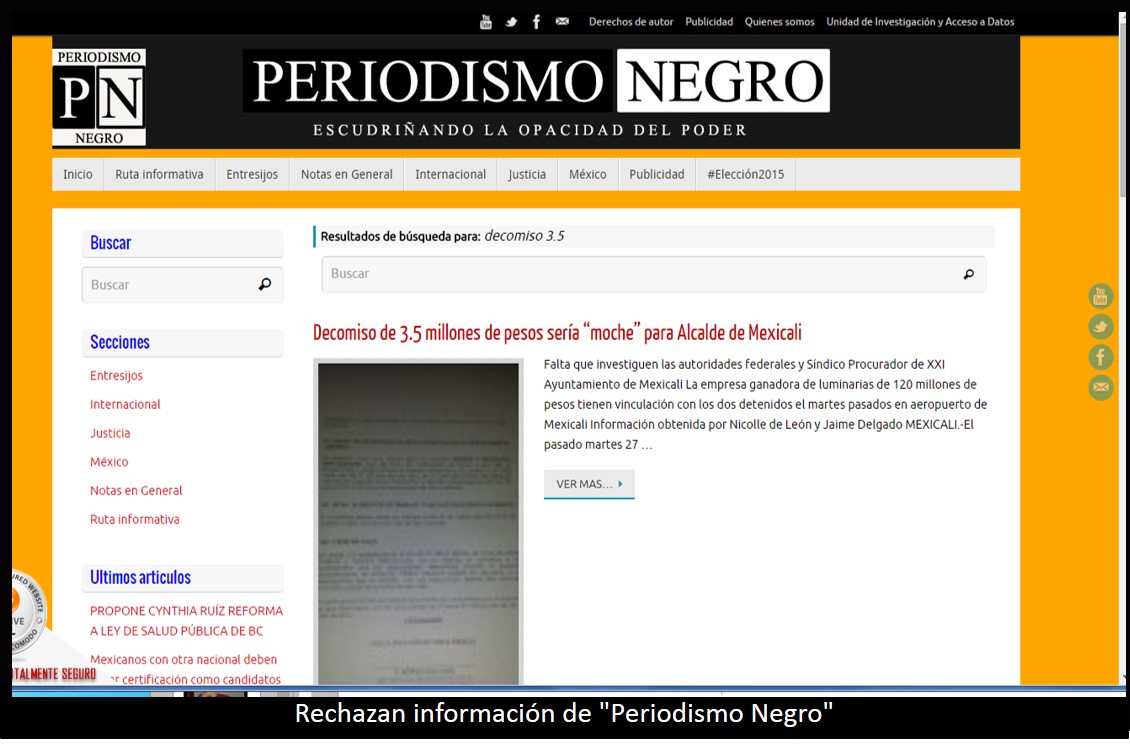 El 30 de octubre pasado, el portal señalado que encabeza el periodista Jaime Delgado, publicó una información bajo el título: "Decomiso de 3.5 millones de pesos sería moche para Alcalde de Mexicali", en la que menciona a la referida empresa.