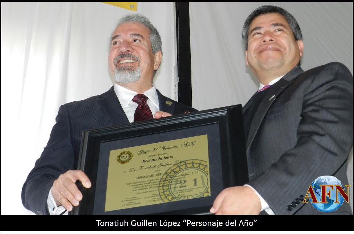 TIJUANA BC 30 DE NOVIEMBRE DE 2015 (AFN).- Este lunes, el presidente del Colegio de la Frontera Norte (Colef), Tonatiuh Guillen López, recibió el reconocimiento de "Personaje del Año 2015" por parte de los miembros del denominado Grupo 21 de Tijuana.