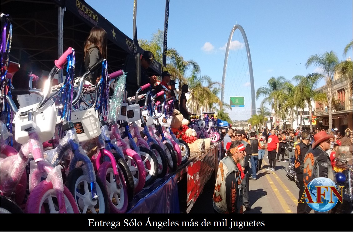 TIJUANA BC 13 DE DICIEMBRE DE 2015 (AFN).- El club de motociclistas “Sólo Ángeles”, entregó este día más de mil 500 juguetes a centenares de menores que se dieron cita para esta tradicional fiesta que se realiza sobre la avenida Revolución, de la Zona Centro de Tijuana.