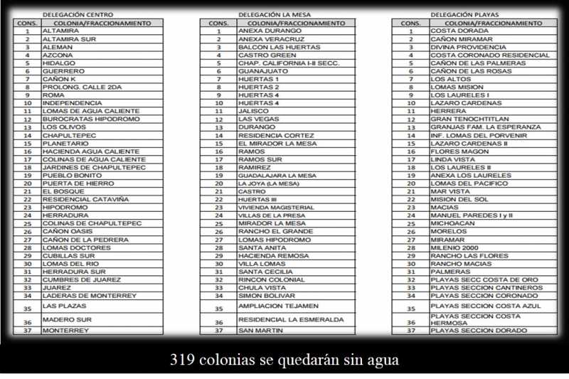 Son 319 colonias las que se verán afectadas durante estos trabajos, 309 correspondientes a Tijuana y 10 a Playas de Rosarito. Para conocer las colonias visita el siguiente enlace.