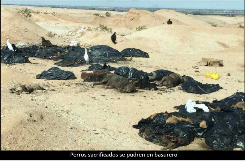 En una visita de ciudadanos al basurero municipal “Hipólito Rentería” que se localiza sobre la carretera a San Felipe se pudo observar decenas de cuerpos de perros en estado de descomposición.