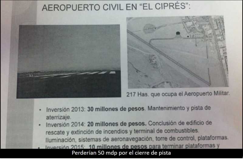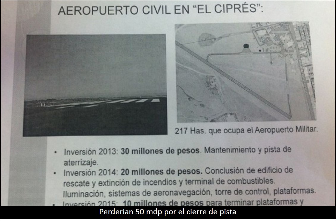 De acuerdo a lo informado por Arteaga Sahagún los funcionarios estatales con los que trató el tema le dijeron que ya no se invertiría más en El Ciprés, pues pronto habría un aeropuerto en Ojos Negros.