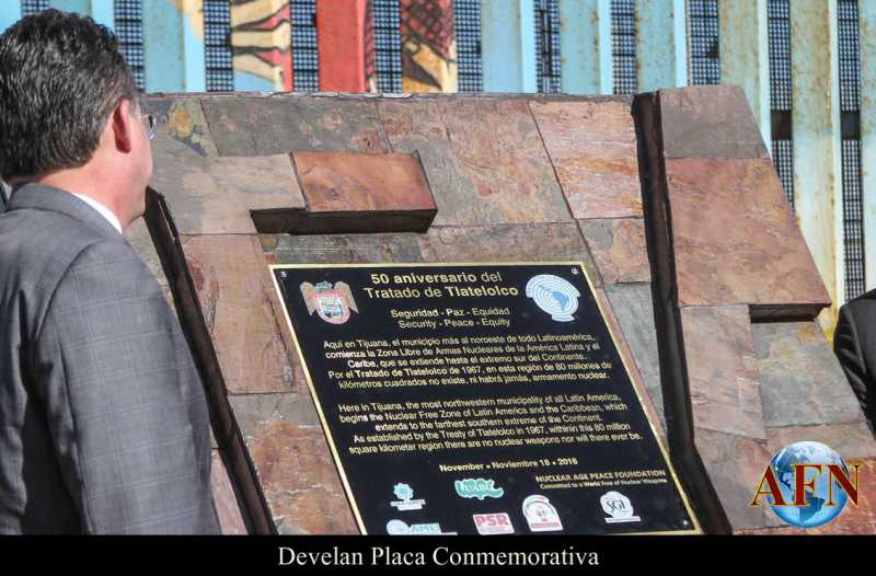 TIJUANA BC 18 DE NOVIEMBRE DE 2016 (AFN).- Esta mañana se llevó a cabo la develación de la Placa Conmemorativa del 50 Aniversario del Tratado de Tlatelolco, en Playas de Tijuana, la cual se instaló justo “en el lugar donde comienza la patria”, informó Gilberto Leyva Camacho, presidente de la Cámara de Nacional de Comercio (Canaco).