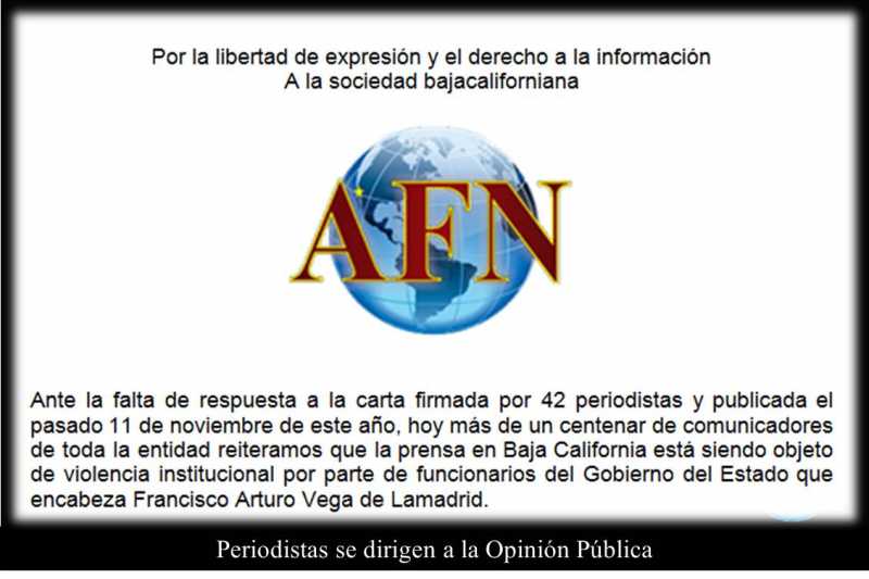 Ante la falta de respuesta a la carta firmada por 42 periodistas y publicada el pasado 11 de noviembre de este año, hoy más de un centenar de comunicadores de toda la entidad reiteramos que la prensa en Baja California está siendo objeto de violencia institucional por parte de funcionarios del Gobierno del Estado que encabeza Francisco Arturo Vega de Lamadrid.