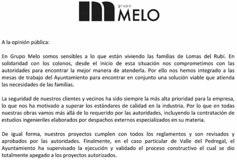 “En Grupo Melo somos sensibles a lo que están viviendo las familias de Lomas del Rubí. En solidaridad con los colonos, desde el inicio de esta situación nos comprometimos con las autoridades para encontrar la mejor manera de atenderla”, comentaron.