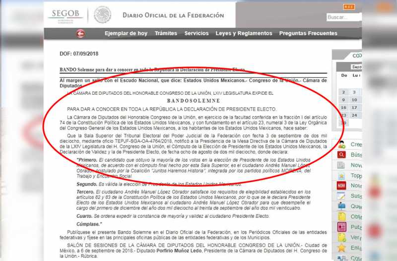 CIUDAD DE MEXICO 7 DE SEPTIEMBRE DE 2018 (AFN).- Hoy viernes 7 de septiembre de 2018, la Secretaría de Gobernación (Segob) dio a conocer, mediante la publicación de ley en el Diario Oficial de la Federación (DOF), la "Declaración de Presidente Electo", del ciudadano Andrés Manuel López Obrador.